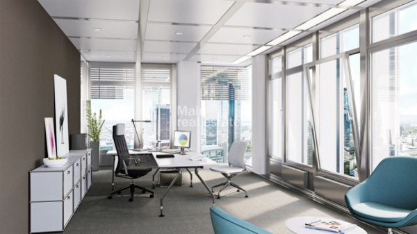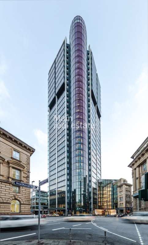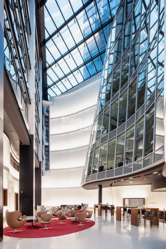 The Eurotheum was completed in 2000 and extensively modernized after the ECB moved out. The entrance and lobby area is particularly impressive. The eye-catcher is the LED wall running across several floors. The lobby has a manned reception and a high-quality bar/bistro concept. Six panoramic elevators provide access to the upper floors, which are located in the glazed curve on the corner of Junghofstrasse. The high-rise floors can be divided into approx. 380 and 250 m², and the rooms have been redesigned. The room layout is flexible and all types of offices can be ideally arranged thanks to the axial dimension of approx. 1.35 m and a room depth of approx. 5.50 m. A special feature is the almost floor-to-ceiling windows that can be opened completely thanks to the double glass façade. The other technical equipment is state-of-the-art and includes raised floors, metal chilled ceilings and ventilation. The upper floors offer a unique, almost unobstructed panoramic view of the skyline. The elegant low-rise building is currently available for rent.