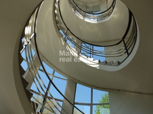 The property was built in 1950/51 to a design by the well-known architect Ernst Balser and is now a listed building. The stairwell with its large round glazing is a striking eye-catcher with a high recognition value. The property was extensively modernized in 1990. The entrance area is bright and appealing, the space can be used extremely efficiently and has, among other things, beautiful parquet flooring, openable windows and BAP-compliant lighting. Parking spaces can be rented on the property, and there is also a large canteen/lounge and archive room in the basement.