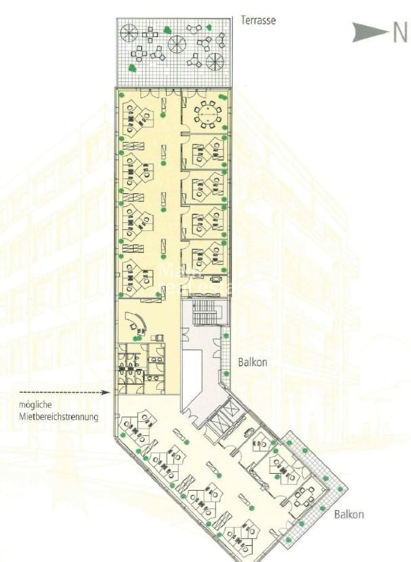 The 5-storey office building with a three-storey wing to the side was built in 2002. The foyer has a bright and modern design. The upper floors are accessed via two passenger elevators. The office space is furnished to a high standard.