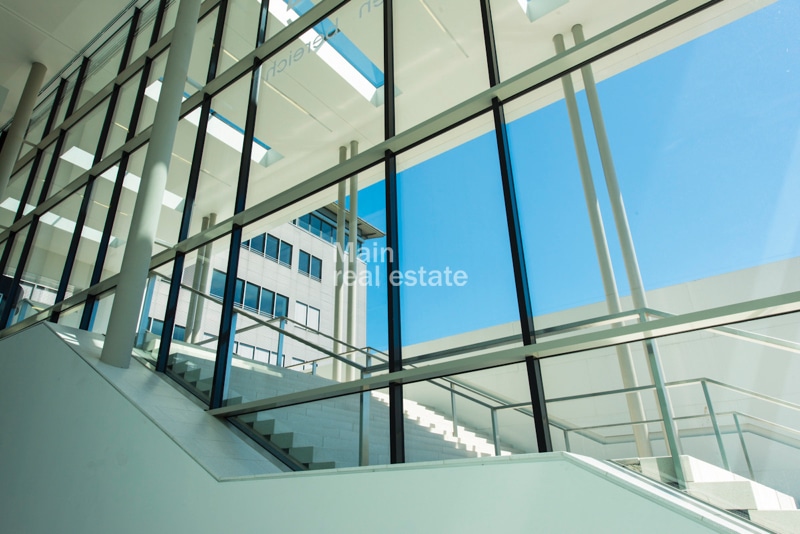 The imposing building was extensively revitalized between 2008 and 2011, including the entire building technology, and now impresses with a modern aluminium and glass façade and curved roofs. The south-facing open comb structure of the office blocks and the large viewing terrace with a view of the Taunus on the first floor are characteristic features. The building consists of 4 independent sections, each with its own foyer. On the upper floors, individual, combined and open-plan solutions with a clear room height of up to approx. 3.50 m are possible. The building has a modern staff restaurant with more than 200 seats and a coffee bar. Another attraction is the Fit7 Eleven fitness club with an area of approx. 1,200 m².