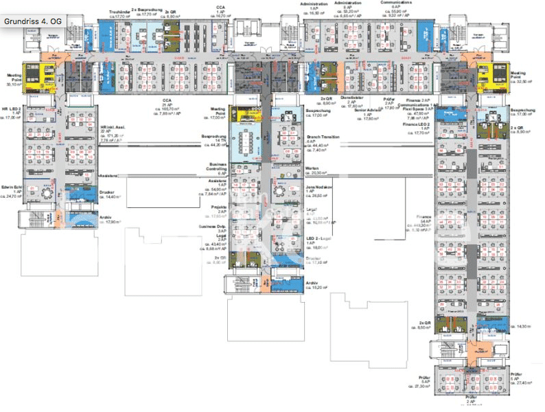 Das Gebäude wird über vier repräsentative Eingangsbereiche erschlossen, die mit Natursteinböden und teilweise verglasten Aufzugsanlagen ausgestattet sind. Die Büroflächen verfügen über großzügige, raumhohe Fenster sowie eine Deckenhöhe von ca. 2,75 m, wodurch helle und angenehme Arbeitsbedingungen geschaffen werden.
