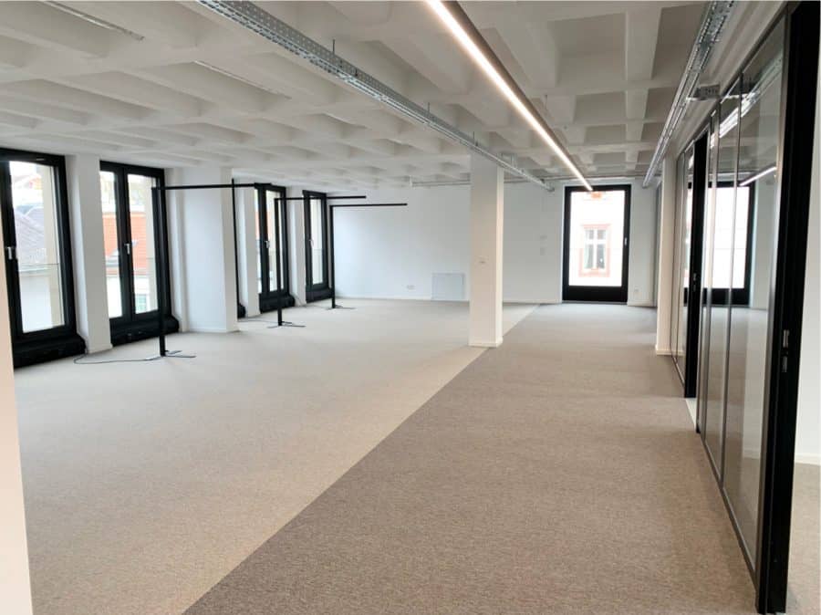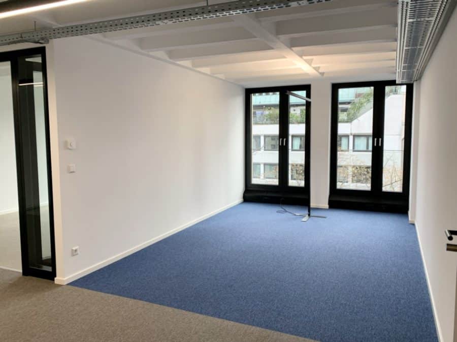 Zur Ausstattung zählen Systemtrennwände (teilweise verglast), hochwertige Teppichbodenfliesen, LED-Beleuchtung, Fußbodenheizung und CAT-7-Verkabelung.